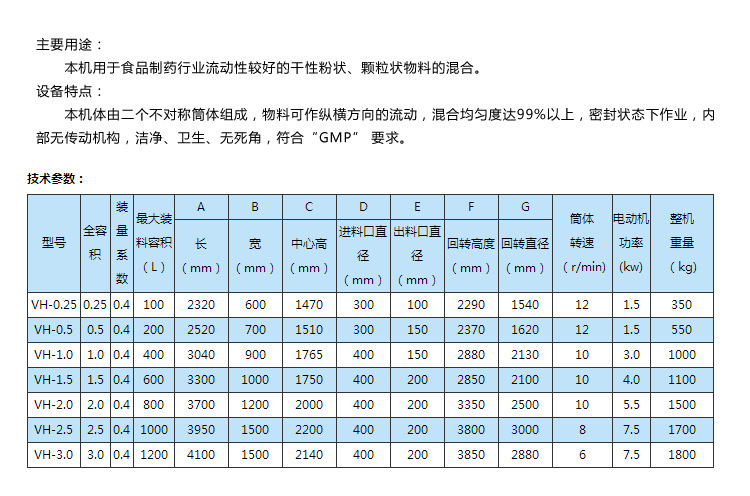 產(chǎn)品概述: 本機(jī)適用于制藥、化工、食品的干粉狀、顆粒裝物料的混合。該機(jī)混料筒結(jié)構(gòu)獨(dú)特,混合均勻,效率高,不積料。整機(jī)結(jié)構(gòu)簡(jiǎn)單,操作容易。外表面和物料接觸部分均采用優(yōu)質(zhì)不銹鋼制造,造型美觀(guān),維護(hù)、清洗方便。 應(yīng)用場(chǎng)景: 本機(jī)用于制藥及其它行業(yè)的粉狀或粒狀物料混合之用。本系列混合機(jī)有高效混合型和普通混合型兩種,高效型混合機(jī)主要對(duì)較細(xì)的粉粒或?qū)δ骋恢髁虾枯^少的物料均能混合均勻;普通型混合機(jī)主要適用于一般物料或產(chǎn)量較大的企業(yè)使用。筒體光滑無(wú)死角、整機(jī)采用不銹鋼材料制作、且外型美觀(guān)等特點(diǎn)。 工作原理: 本機(jī)一端裝有電機(jī)與減速機(jī),電機(jī)功率通過(guò)皮帶傳給減速機(jī),減速機(jī)再通過(guò)聯(lián)國(guó)器傳給V型桶。使V型桶連續(xù)運(yùn)轉(zhuǎn),帶動(dòng)桶內(nèi)物料在桶內(nèi)上、下、左、右進(jìn)行混合。 材質(zhì)及結(jié)構(gòu): 1、 混合機(jī)的筒體采用2.5mm304-2B不銹鋼材料制作,外包采用1.2mm304-2B的不銹鋼材料制作,支架采用5#槽鋼。 2、混合的出料閥選用全不銹鋼精加工而成,并在連接處采用定型硅橡膠材料密封,確保機(jī)器在工作時(shí)的密封效果。 3、混合機(jī)的進(jìn)料口采用選進(jìn)的快開(kāi)結(jié)構(gòu),使用戶(hù)在進(jìn)料和清洗時(shí)操作簡(jiǎn)便。 4、混合機(jī)筒體兩側(cè)拼縫處加焊兩塊不銹鋼引板并采用拋光處理,使筒體內(nèi)無(wú)一處死角,確;旌蠙C(jī)在混合、清洗時(shí)能夠達(dá)到理想的效果。 5、混合機(jī)內(nèi)設(shè)有強(qiáng)制攪拌裝置。